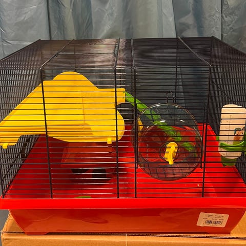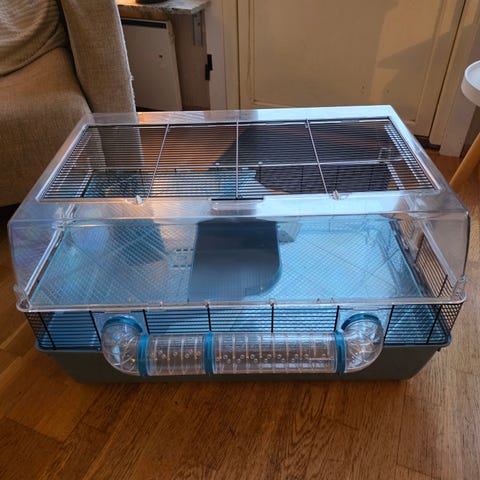 Hamsterbur, spån, hage, vattenflaska, hamsterhjul, sand och leksaker