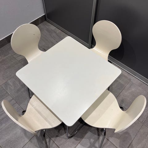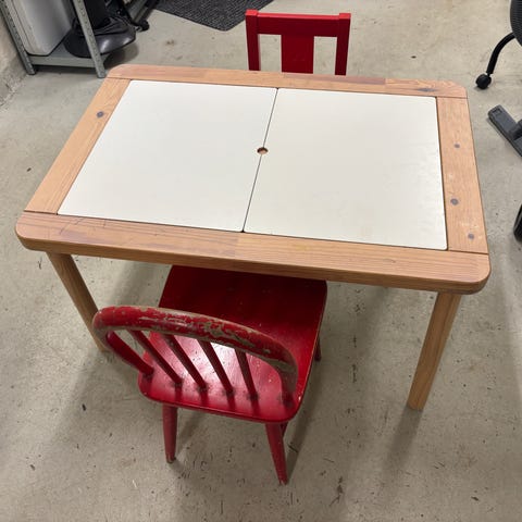 IKEA barnbord med mått anpassade för barn. Bordet är tillverkat av trä med en yta av vit plast, utrustat med två inbyggda förvaringslådor i gul och grön plast. Lådorna är avtagbara och bordet har ben i trä. Passar för barnrum och aktiviteter som kräver förvaring av småsaker eller leksaker. Bordsytan är väl använd och har märken från både färg och play-dough. Förutom kosmetiska defekter så är bordet stabilt och fungerar felfritt. De två trofast backar som syns på bilden ingår.