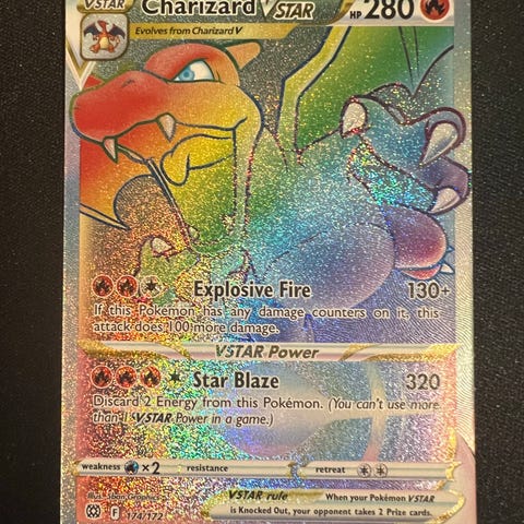 Pokémon Charizard samlarkort med 150 HP. Kortet visar Charizard med förmågan Energy Burn och attacken Fire Spin som kräver energi för att användas. Kortet är i plastficka för skydd.