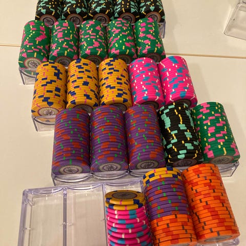Cardinal Professional Poker Chips Set med 100 dubbelsidiga pokerchips och dealerknapp. Inkluderar tärningar. Lämplig för pokerspel och andra spel som kräver pokerchips.