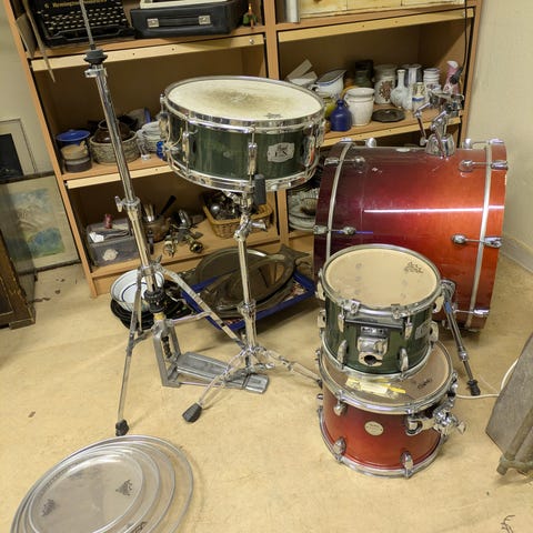 Bastrumman har mapex-skinn, virveln har mapex underskinn och Remo emperior slagskinn. Pukorna har nyare milleniumskinn.