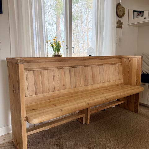 Säljer en vacker och rejäl kyrkbänk i trä med fin patina. Hela ca 4 meter lång – perfekt som statement-möbel i hall, uterum, veranda eller större rum.