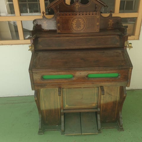 Speldosa med orgel och ängel, handmålad från Erzgebirge i Tyskland. Musiklådan är fungerande. Figur av den klassiska ängeln med 11 punkter på vingarna, sitter på en bänk bredvid det trippelledade orgelet. Vid sidorna ljusstakar och på hörnen änglar. Spela med melodin 'Ihr Kinderlein kommet `, med titeln på noten. HxBxD: 14,5 x 10,5 x 9,5 cm.