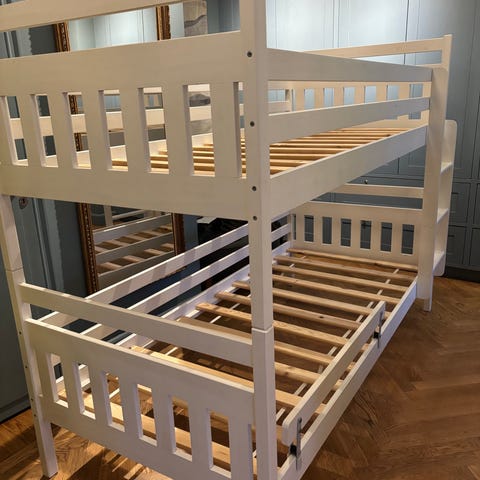 Sängen är använd, men har inga skador eller nötningar. Har stått kvar i ca 10 år. Vitmålat trä. med stege och nya madrasser av IKEA fabrikat. Sängen är inte nedmonterad och kan ses före köp.