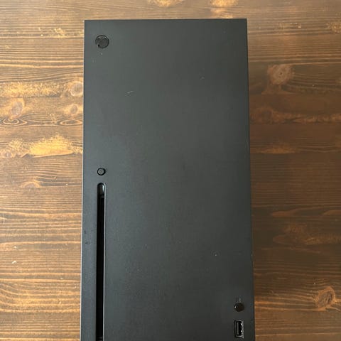 Microsoft Xbox Series X spelkonsol i svart färg. Konsolen har en vertikal design med en diskettplats på framsidan. Passar för spel och underhållning på Xbox Series-plattformen.