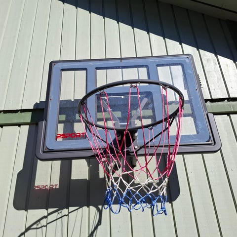 Basketkorg med nät, avsedd för inomhus- eller utomhusbruk. Tillverkad i metall och plast, med röd, vit och blå färg på nätet. Passar för basketspel och träning. Fästes på vägg med skruvar.