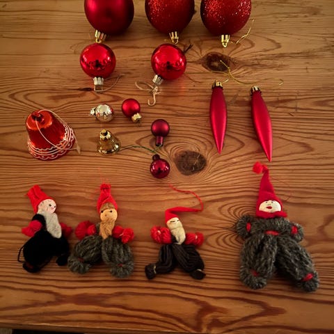 SÀljer olika Tradition Jul Dekoration Julgransprydnader i rött, inklusive smÄ tomtar, klockor och julgranskulor.
