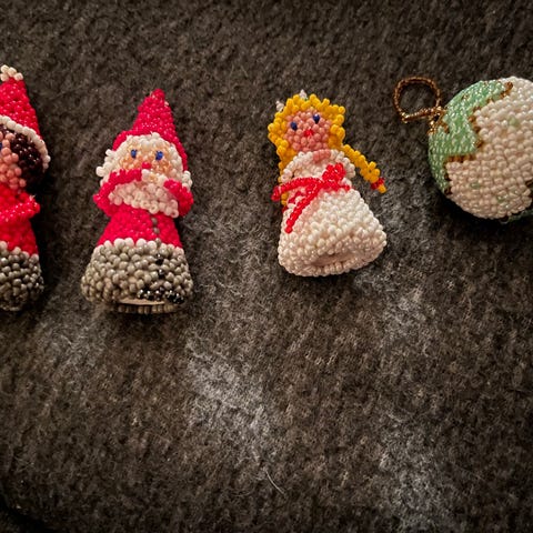 Tillverkade av textil och metallmaterial, lÀmpliga för juldekorationer.