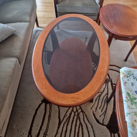 Sexkantigt soffbord i massivt trä med glasskiva. I bra skick. 60x69x49 cm.