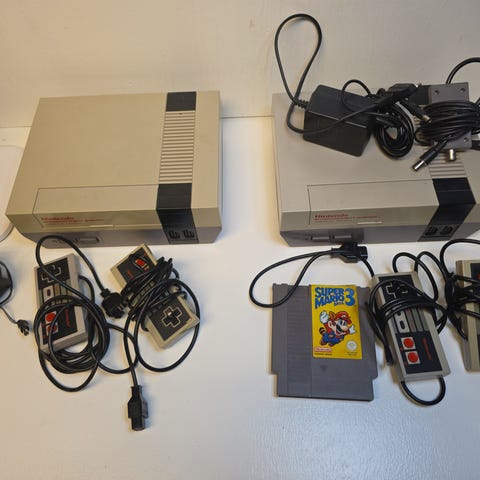 Nintendo Entertainment System spelkonsol inklusive en Super Mario Bros 3 spelkassett. Spelkonsolen är av 8-bitars typ och levereras med en handkontroll och nödvändiga kablar för anslutning och strömförsörjning.