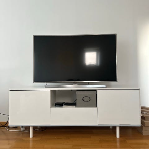 Tv bänk i vitt i bra skick. En liten skada kan ses på det högra hörnet av möbeln.