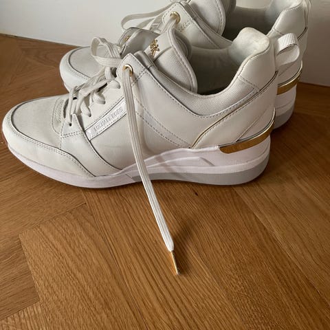 Tamaris Sneakers i storlek 38 med en kombination av vita och guldfärgade detaljer. Skorna har snörning och dragkedja på sidan för enkel på- och avtagning. Sulan är mönstrad för bättre grepp. Materialet är en mix av syntet och textil. Passar för vardagligt bruk. Har en ljuvlig innersula som är gjord i skummaterial, jättesköna att gå i. Säljes pga fotskada