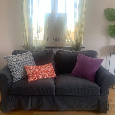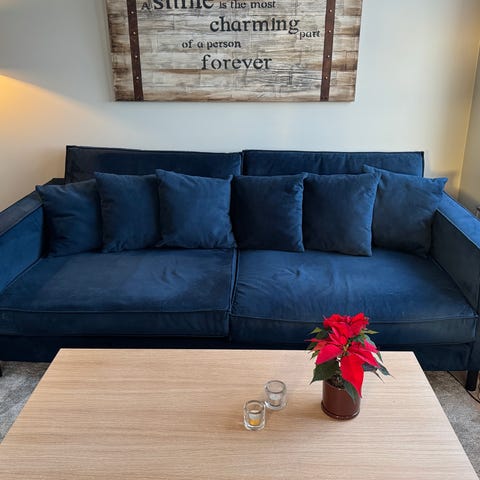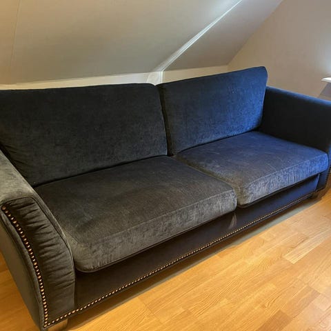 Bekväm smidig sammet blå Soffa 2-sits i gott skick, ingen skador eller fläckar och fräsch & Ren , ingen djur & rökfritt. Helt avtagbart tvätt överdrags och dynor. Perfekt för mindre rummet eller Studentrummet