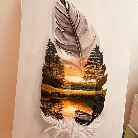 Oidentifierad målning som föreställer ett kustlandskap med båtar och hus vid vattnet. Målningen visar en scen med flera båtar i förgrunden och klippor med hus i bakgrunden under en blå himmel med moln.