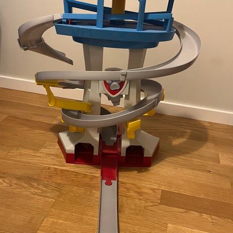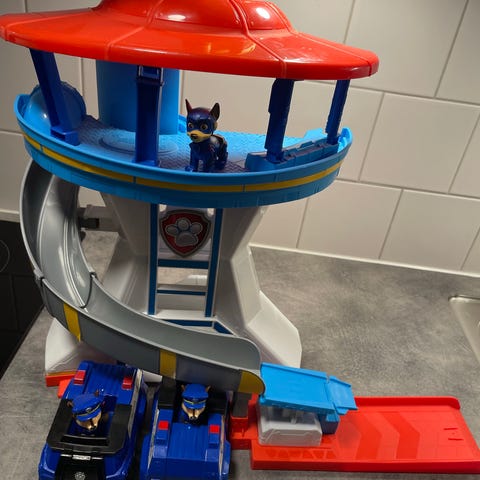 Paw Patrol lekset spel med rutschbana i plast. Setet har flera nivåer och en spiralformad rutschbana. Färgerna är röd, blå, gul och grå. Lämpligt för barn att leka med och utveckla motoriska färdigheter.
