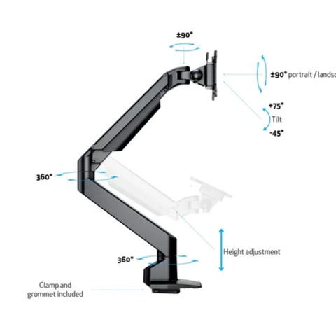 Essentials Single Gas bildskärmsarm som kan bära upp till 45” och 13 kg skärmar. Armen erbjuder kompatibilitet med 100x100 eller 75x75 VESA-monteringsstandarder för enkel installation.