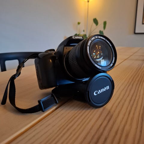 Canon kamerahus, med kameraväska, batteri och laddare. Svart färg, lämplig för fotografering i olika miljöer. Extra batterifacket dock uran batterier, fungerar med AA batterier och med 2 extra orginalbatterier från Canon. Normaloptiken följer med men fungerar inte då den rätt var det är hänger sig. Kamerahuset fungerar felfritt