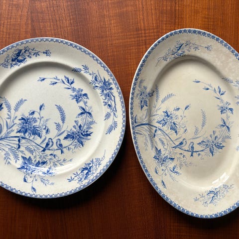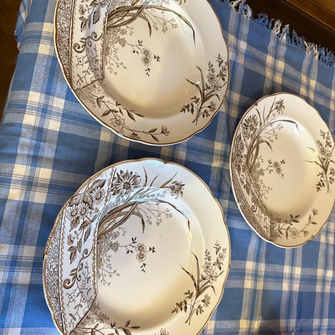 Tre djupa tallrikar (24,5 cm) från Gustavsberg, modell Asiatic Pheasants i lila. Tillverkade i slutet av 1800-talet.