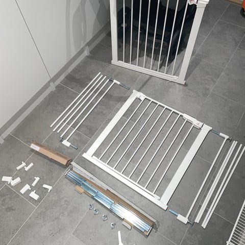 Robust och gedigen säkerhetsgrind 77,3cm - 83,5cm. Understa delen lyser i mörkret. Använt endast under ett par månader då vi trodde vi behövde två men insåg att det räcker med ett.