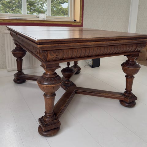 Bordet är (utan utdragen extraskiva) 135 cm långt x 105 cm brett ; Höjd 75,5 cm.