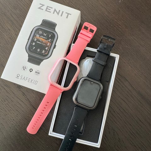 Philippe Palmer smartklocka med vit armband. Inkluderar laddningskabel och användarmanual. Klockan har en rektangulär skärm och är avsedd för användning som en smart wearable-enhet.