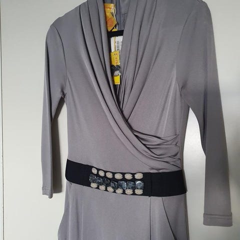 Klänning från by Malene Birger i 100% siden (utsidan). Innerfodret är i viskos och polyester. Dekorativa pärlor och stenar på axlarna och ärmarna. Nypris strax under 4000kr. Stängs med dragkedja i bak. En sten saknas, men annars väldigt bra skick. Storlek 36.