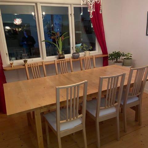 Träbord i massivt trä med robust konstruktion och naturlig träfinish. Bordet har en rektangulär bordsskiva och kraftiga ben med korsformad stödstruktur. Passar för matplats eller arbetsyta. Längd 1,9 m , B 1,05 m , tjocklek skiva 5 cm , helt spik och skruvfri . Bra skick.