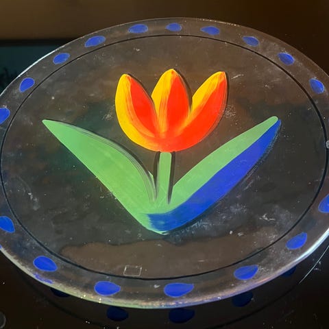 Det vackra serveringsfatet Wild Rose är designat av Alberto Churba. Serveringsfatet är i glas och tillverkades på 1980-talet.