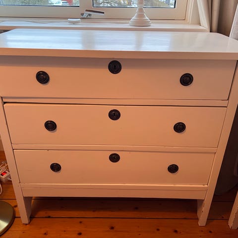 Hög byrå med vita lådor 700 kr