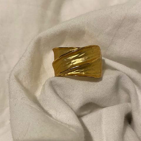 Guldpläterad ring formad som droppande smält guld. Går att justera i omkrets. Droppen ovanpå är ca 25 mm lång. Säljes i ask.