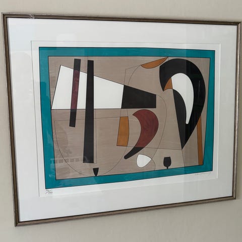 Abstrakt konstverk med geometriska former i olika färger, inramad och klar för upphängning.