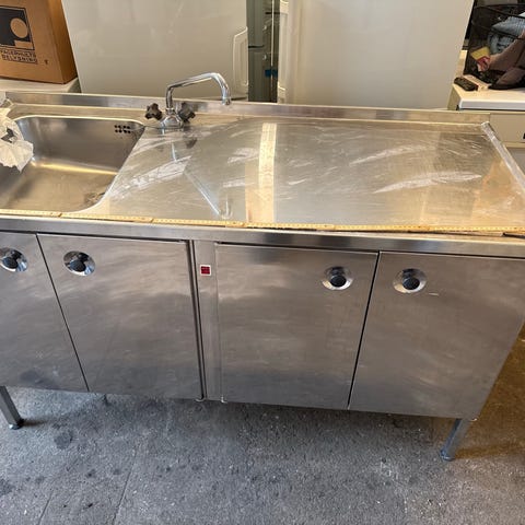 Stor rostfri diskbänk med två djupa hoar och underställning i metall. Höjden är cirka 90 cm. Diskbänken har tecken på användning och slitage.