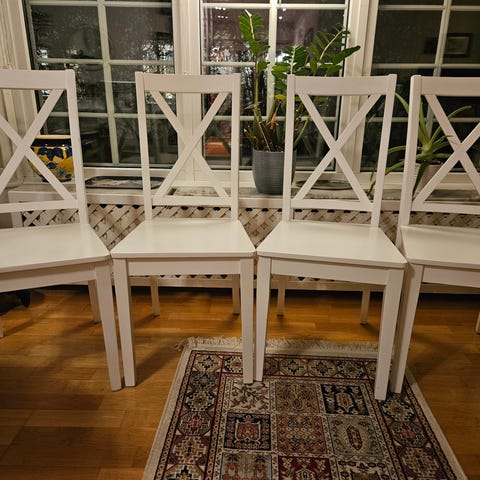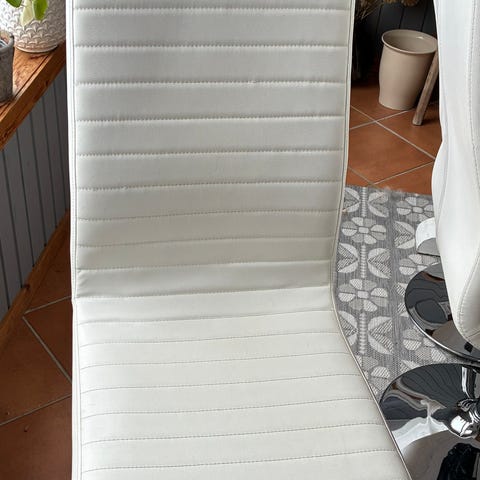 Köksstolar, matsalsstolar. Finns två vita från Mio kvar. Mindre färgskav (se bild) finns men som bör vara enkelt att åtgärda.