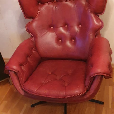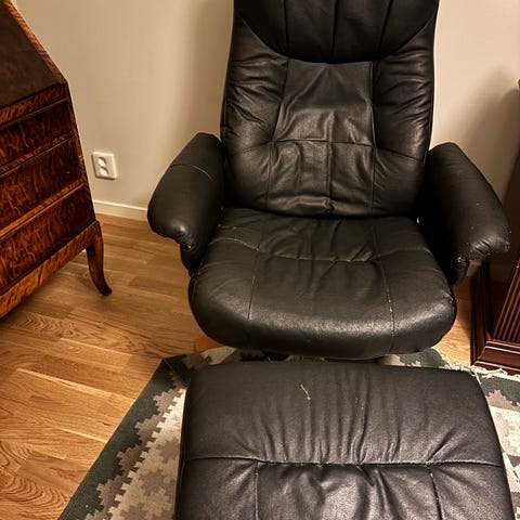 Brun Stressless läderfåtölj i bra skick. Inga stora skavanker förutom ett litet hål på sitsen (se bild).