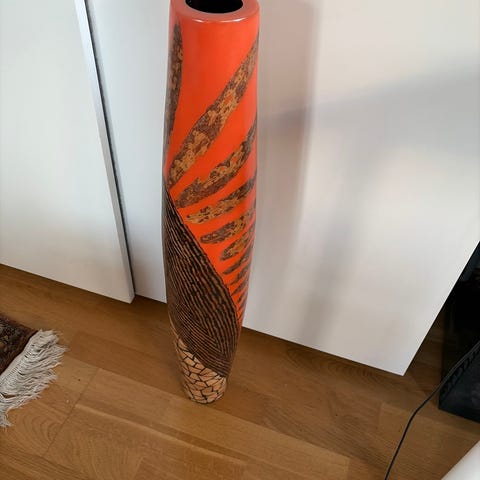 1. Golvurna i keramik, rikligt med ornament , färg går i brunn- guld, längd 62 cm, 20 cm i botten pris: 900 . Kan skickas till självkostnadspris efter överenskommelse