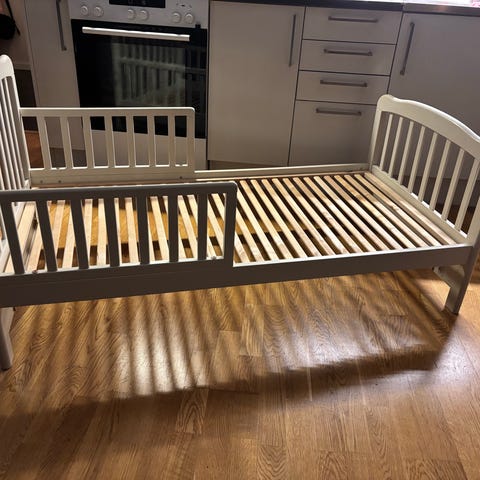 Jollyroom enkelsäng i vit färg, avsedd för barn. Sängen är tillverkad med en enkel och funktionell design som passar i barnrum.
