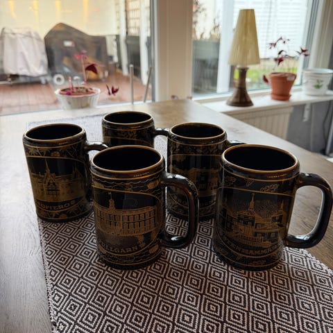 Sällsynt årskrus med motiv av Stenhammars slott, kungligt vapen och dekorativa ekblad. Utgiven 1977 som del av serien Årskrus. Höjd: 13,5 cm Material: keramik / porslin Märkning: "Porslinrand Sweden", "Kungligt slott med huvudbyggnad från 1600-talet" Skick: mycket fint, inga nagg Perfekt för samlare, present eller som dekor i svensk stil.