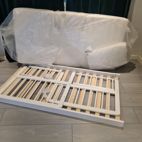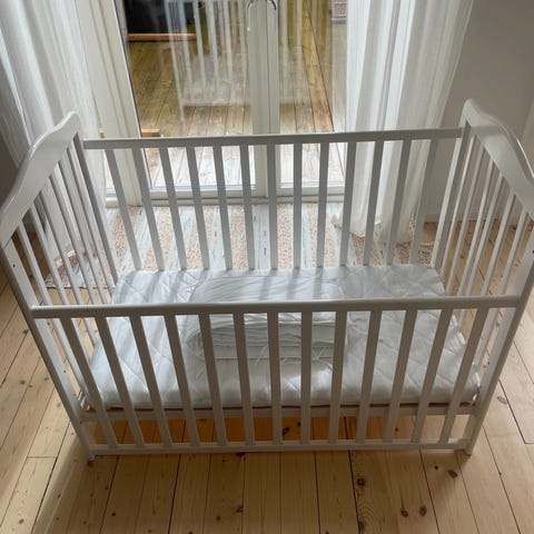 Madrass och sängskydd ingår. Det går att montera av ena sidan om så önskas, för att barnet ska kunna ta sig ur sängen.