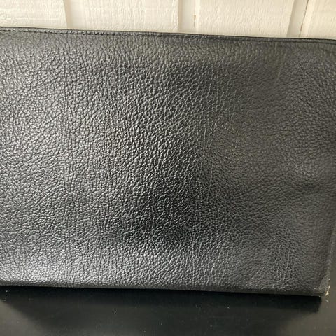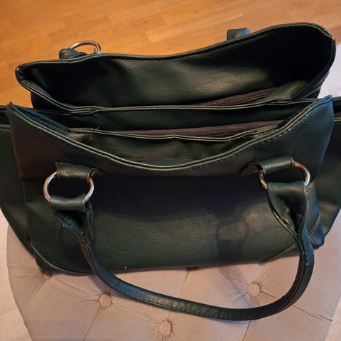 Väskan har 2 dokument fack inuti på vardera långsida. Annars ett stort fack i den. Det står inget om material i den.