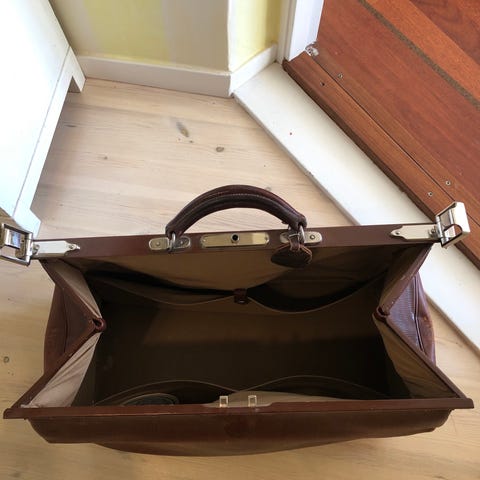 Oanvänd svart vintage doktorsväska med kombinationslås.