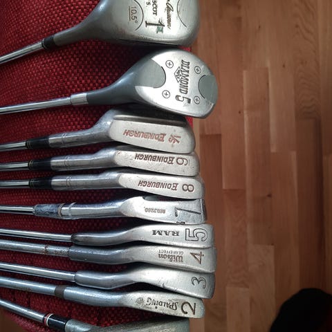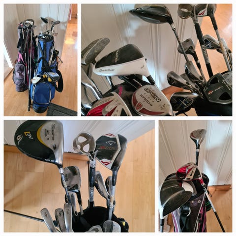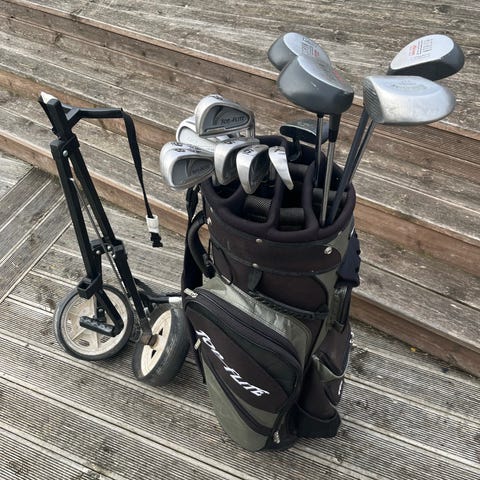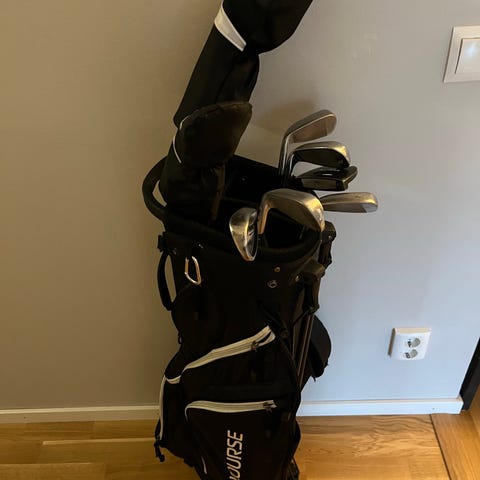 golfklubbor inklusive driver, järnklubbor och putter samt en golfväska. går att hämtas tillsammans i ett set.