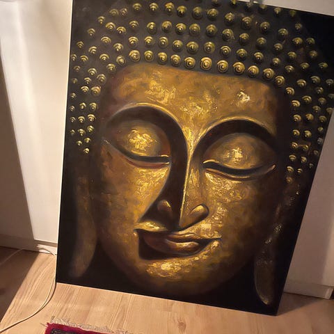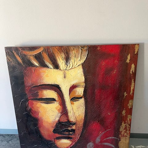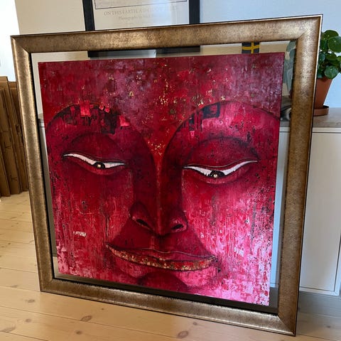Handmålad Buddha-tavla tillverkad ram i trä med detaljerad och dekorativ design. Tavlan har varma färgtoner och ett konstnärligt uttryck som kan användas som väggdekoration i hem eller kontor.