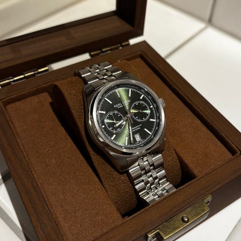 Ingår det blå läderbandet samt ett antal band i olika färger. Dessutom ingår ett 18mm bronsspänne som ej saluförts av Malm. Inkluderar certifikat och kvitto. Inköpt 2023.