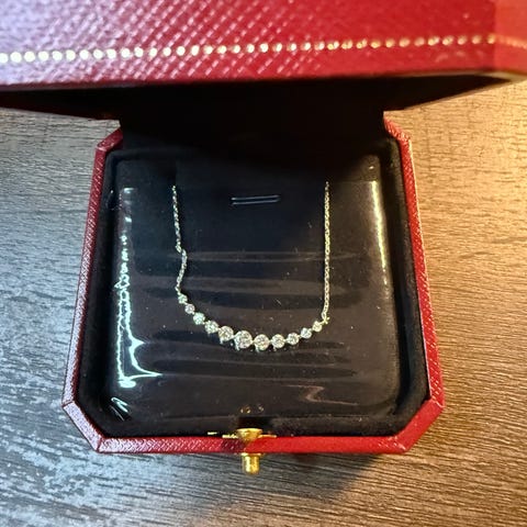 Säljer ett oanvänt halsband från Ennui Atelier då det påminner lite för mycket om ett annat smycke. Ett mindre Ennui fodral medföljer. Belagd med 16 vita diamanter, 0,08ct. Top Wesselton SI1 diamanter. Återvunnet 14k vitguld.