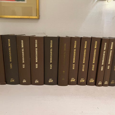 Svensk Travstambok böcker i set, innehållande flera volymer med information om travhästar. Böckerna är i hårda pärmar med guldfärgade bokstäver på framsidan. Används för referens och forskning inom travsport.