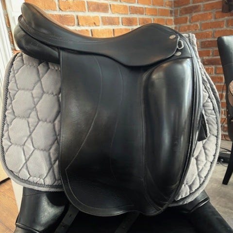 Ideal Crown Ozelle dressyrsadel i mycket fint använt skick. 17 tum med öppet säte och MW bom. Kort anläggningsyta med generös bogfrihet. Ullstoppad med äkta fårull. Omstoppad nyligen. Singelkåpa för close contact. Passar rak mot lätt svängd rygg. Sparsamt använd och förvarad i uppvärmd sadelkammare. Ideal Crown sadelöverdrag ingår. Årsmodell 2016. Nypris ca 27.000 kr.