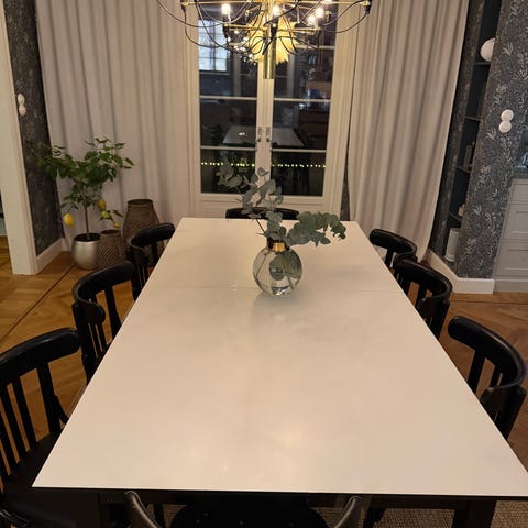Stort matbord med tungt och stabilt underrede i vitlackad metall. Skivan är en lackad MDF som kan tas loss och lackas om när det behövs. Byggt på beställning av snickare.