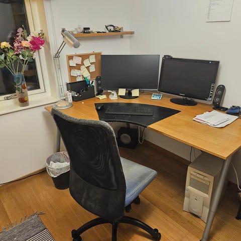 Skrivbordet heter Linnamon och benen Olov. Det medföljer även 2 stolar som är höj- och sänkbara.