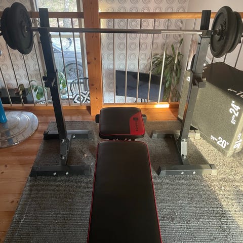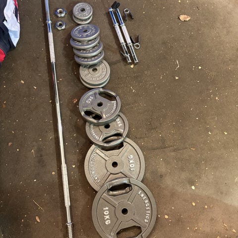 Barbell och hantelset med flera viktskivor i olika storlekar och en förvaringsväska i plast. Setet innehåller stång och handtag för hantlar samt muttrar för att fästa viktskivorna. Passar för styrketräning och kan anpassas efter önskad vikt.