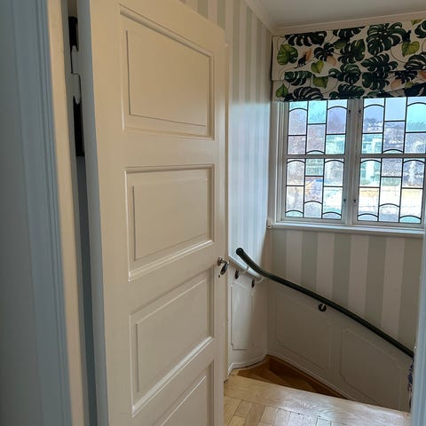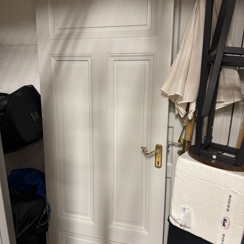 Innerdörr i massivt trä med fem speglar, målad vit. Inklusive karm. Dörren har suttit i en Brommavilla från 1926. Karmyttermått 71*211 cm. Vänsterhängd. Bra skick i trä. Bör slipas och målas.